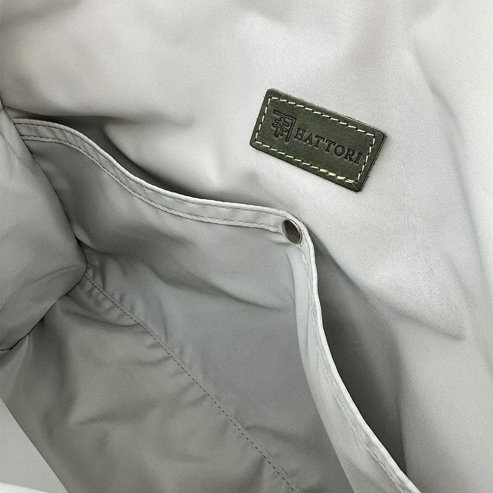 素材には、日本の海洋プラスチックゴミの約4割を占めるとされる「廃漁網」を再生したナイロン生地を採用。 しかし、ただのエコ素材ではありません。リサイクルポリエステルと交織することで、まるで海面の白波のような美しいツイル(綾織り)と、上品な光沢を実現しました。 付属の革には、400年の歴史を持つ「姫路 龍野レザー」を使用。強靭なナイロンと味わい深い本革のコントラストが、大人の品格を演出します。