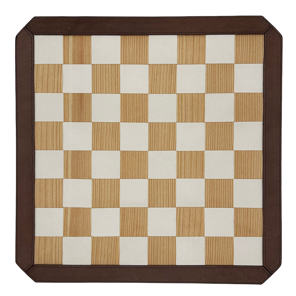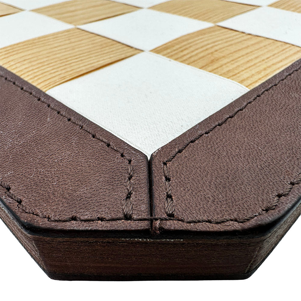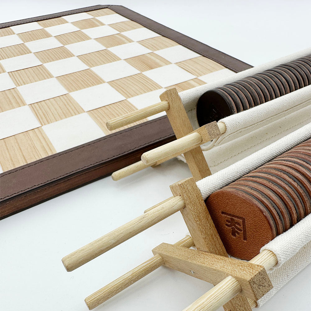 Design House KAZEが独自技術で杉を薄くスライスし、特殊な補強を施すことで柔軟性と耐久性を兼ね備えた木目の美しいテープを開発。さらに、杉材から丁寧に抽出した天然染料で染め上げたコットンテープと、手作業で丹念に編み込むことで、木の温もりと布の柔らかさが融合した唯一無二の盤面を実現しました。その周囲を豊岡の服部が上質な革で縁取り、格調高い重厚感のある仕上がりに。触れるたびに杉の香りが漂い、使い込むほどに艶が増していく経年美を楽しめます。