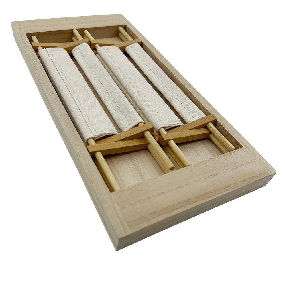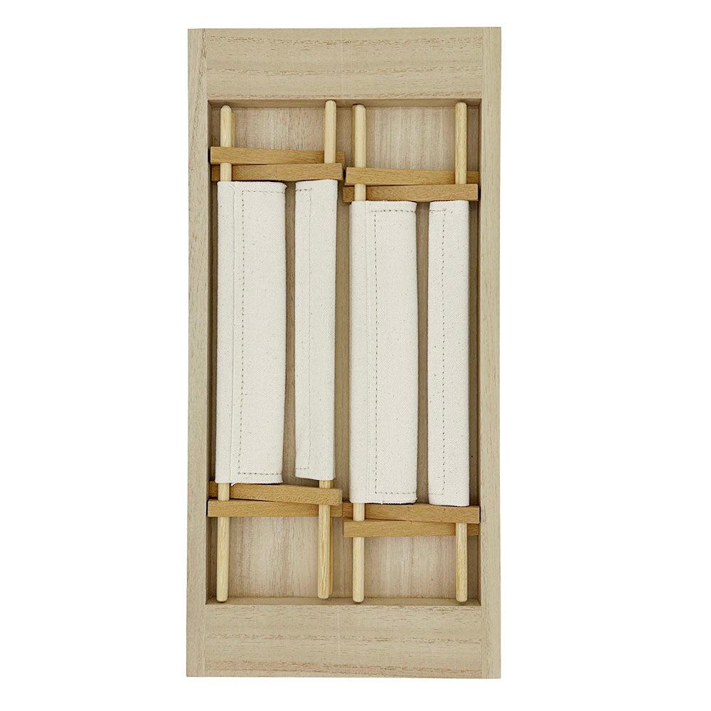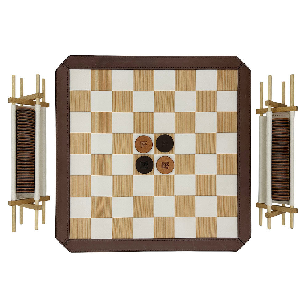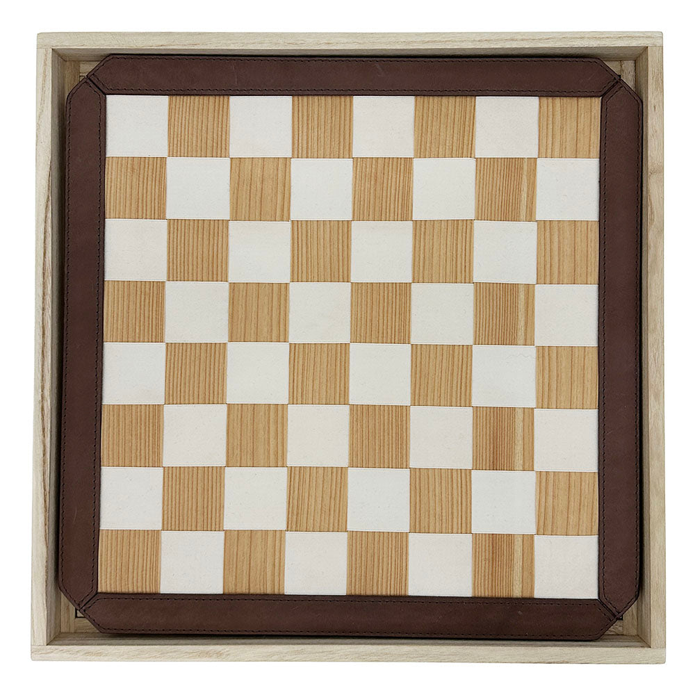 Design House KAZEが独自技術で杉を薄くスライスし、特殊な補強を施すことで柔軟性と耐久性を兼ね備えた木目の美しいテープを開発。さらに、杉材から丁寧に抽出した天然染料で染め上げたコットンテープと、手作業で丹念に編み込むことで、木の温もりと布の柔らかさが融合した唯一無二の盤面を実現しました。その周囲を豊岡の服部が上質な革で縁取り、格調高い重厚感のある仕上がりに。触れるたびに杉の香りが漂い、使い込むほどに艶が増していく経年美を楽しめます。