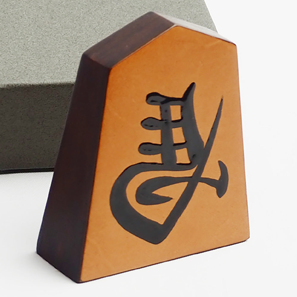 皮革を何層にも重ねて磨き上げ手彫りの文字が刻まれた駒は、まるで使い込まれた高級感漂う木製の駒のような仕上りとなりました。