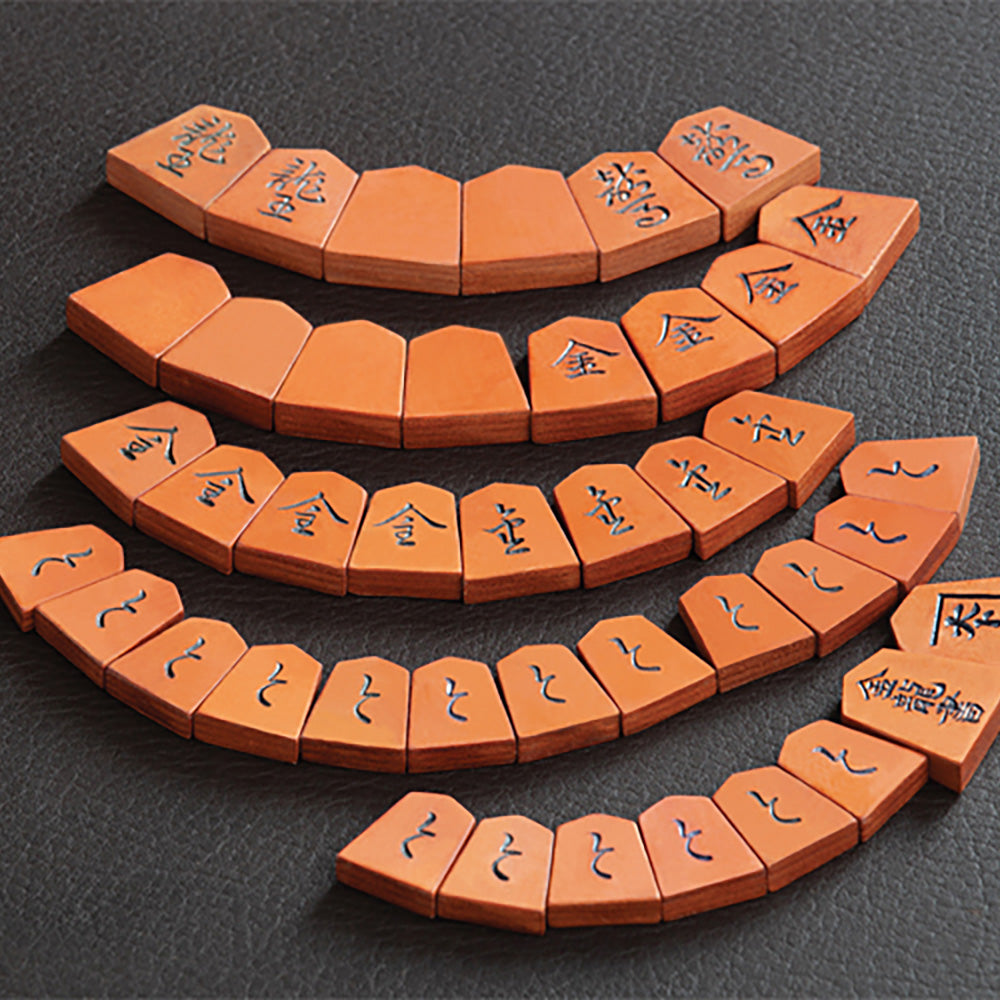 皮革を何層にも重ねて磨き上げ手彫りの文字が刻まれた駒は、まるで使い込まれた高級感漂う木製の駒のような仕上りとなりました。