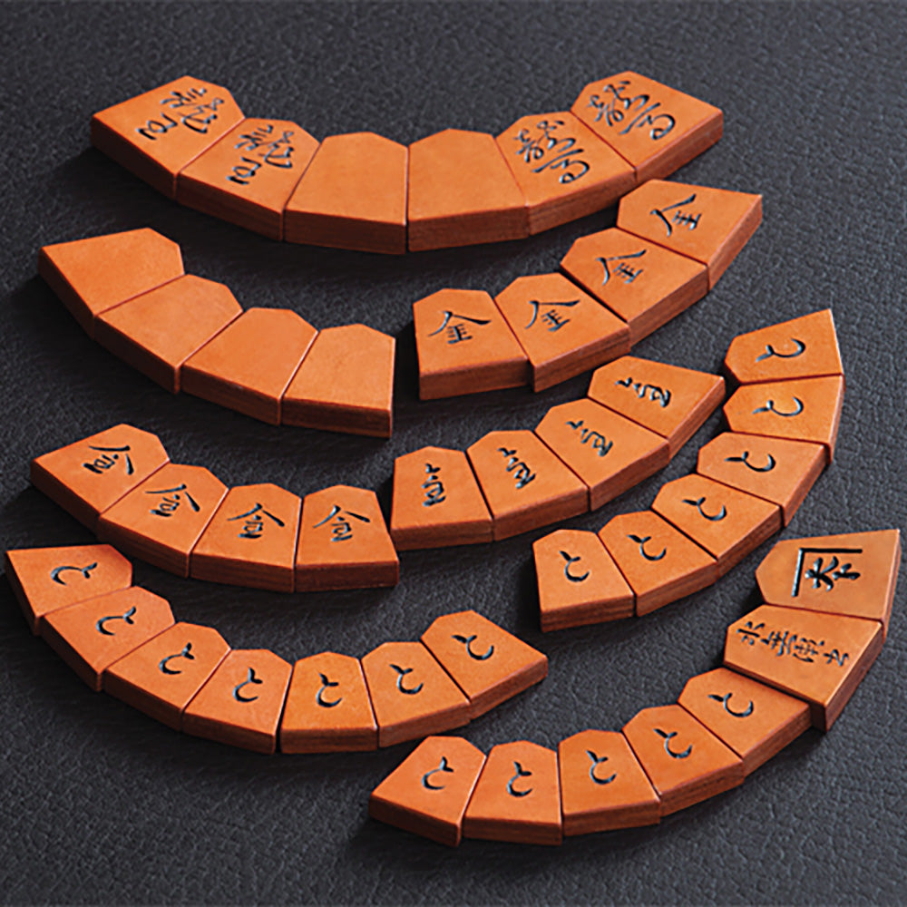 皮革を何層にも重ねて磨き上げ手彫りの文字が刻まれた駒は、まるで使い込まれた高級感漂う木製の駒のような仕上りとなりました。