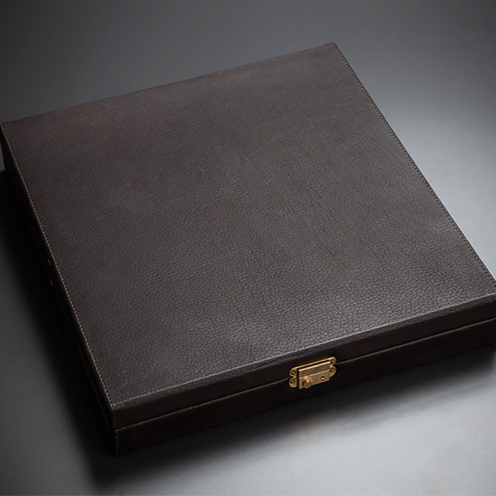 その想いで採用したのは、豊岡のアタッシュケースを得意とする職人と共同で製造した本格牛革将棋駒セット専用の保管ケース。