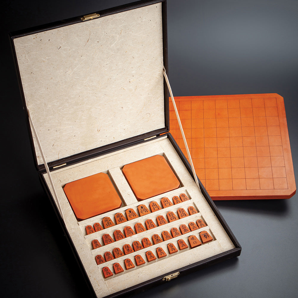 将棋駒だけではなく、“将棋盤”と“駒置き”、“保管ケース”まで、すべて牛革で作成しました。